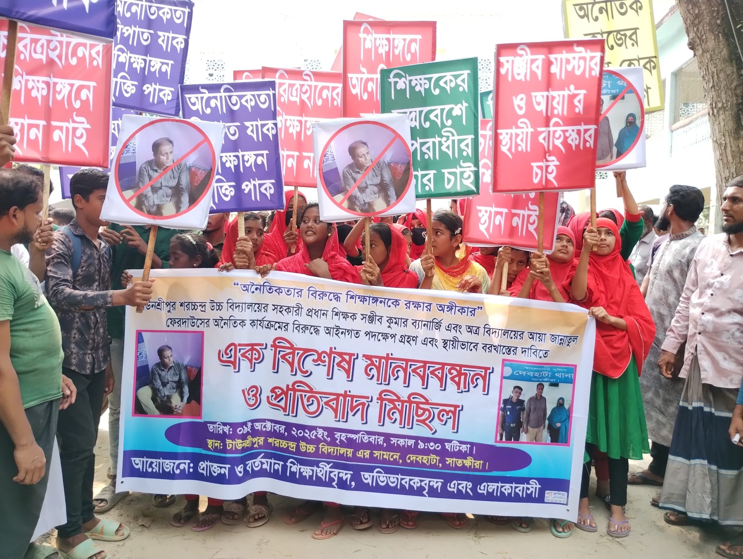 সাতক্ষীরা প্রতিনিধি: সাতক্ষীরার টাউন শ্রীপুর শরচ্চন্দ্র উচ্চ বিদ্যালয়ের সহকারী প্রধান শিক্ষক জনাব সঞ্জীব কুমার ব্যানার্জী ও স্কুলের আয়া জান্নাতুল ফেরদৌসের একটি অসামাজিক ও অনৈতিক অনৈতিক কর্মকান্ডের সুষ্ঠ তদন্ত ও দৃষ্টান্তমূলক শাস্তি দাবিতে মানববন্ধন করেছে শিক্ষার্থী ও অভিভাবকরা। বৃহস্পতিবার (৯অক্টোবর) বিদ্যালয়ের সম্মুখ সড়কে এ মানববন্ধন কর্মসূচি পালন করা হয়।পরে উপজেলা নির্বাহী কর্মকর্তার কার্যালয়ে এসে স্মারকলীপি প্রদান করা হয়৷
