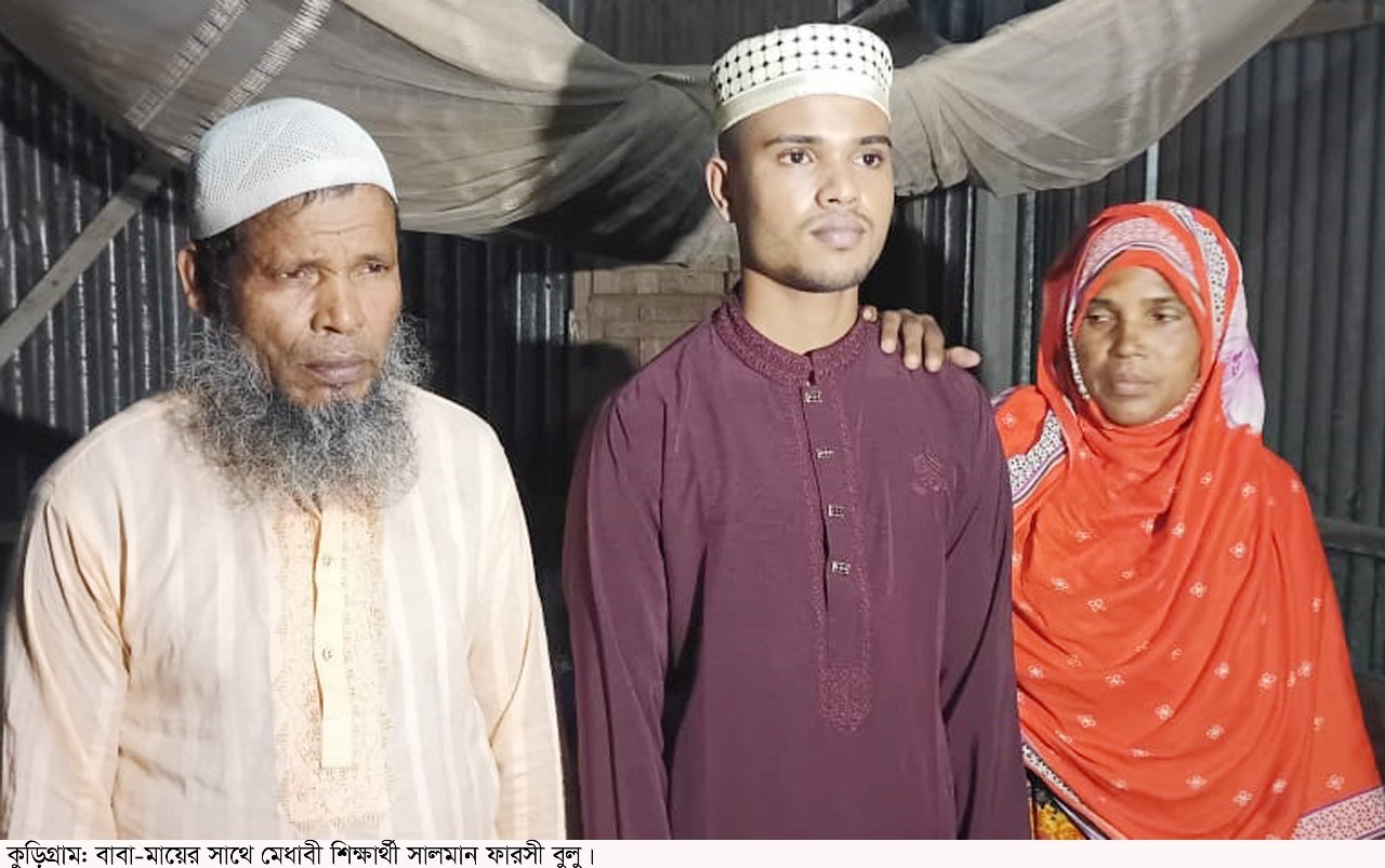 হুমায়ুন কবির সূর্য, কুড়িগ্রাম: পড়াশুনাটাই বন্ধ হয়ে যাচ্ছিল দরিদ্র পরিবারের মেধাবী সন্তান সালমান ফারসী বুলুর। দিনমজুর বাবা হাঁটুতে ব্যাথা পাওয়ায় ঠিকমতো কাজে যেতে পারছিলেন না। সংসারে চলছিল প্রচন্ড টানাটানি। বড় ভাই দুলু মিয়া তখন ৮ম শ্রেণিতে পড়ে। বাবার দুরবস্থা দেখে সে পড়াশুনা থামিয়ে কাঠমিস্ত্রীর কাজে যোগ দেয়ায় সংসারে কিছুটা ফিরে আসে স্বস্থি। ছোট্ট সালমান ফারসী তখন প্রতিটি ক্লাসে প্রথম হয়ে সবাইকে চমকে দিচ্ছিল। তার পড়াশুনার আগ্রহ থাকলেও আনুসাঙ্গিক খরচ মেটাতে হিমসীম খাচ্ছিল পরিবারের লোকজন। এক সময় মনে হচ্ছিল পড়াশুনাটা বন্ধ করে পরিবারকে সহায়তা করতে শ্রমের কাজে যুক্ত হতে হবে। তবে মাদ্রাসায় তার ভালো ফলাফলের কারণে বড় ভাইসহ স্বশিক্ষিত বাবা-মা কখনো বাঁধা দেননি পড়াশুনায়। এই পরিস্থিতিতে সালমান ফারসী পড়াশুনার খরচ জোটাতে প্রতিবছর ক্লাস ফাঁকি দিয়ে দুই থেকে তিন মাস শ্রমের কাজে চলে যেত ঢাকা, চট্টগ্রাম, কুমিল্লাসহ দেশের বিভিন্ন এলাকায়। রাস্তায় মাটির কাজ ও রাজমিস্ত্রীর জোগালির কাজ করে যে অর্থ উপার্জন করতো তার কিছুটা পরিবারকে দিয়ে বাকিটা পড়াশুনার কাজে ব্যবহার করতো। শিক্ষকরা মাদ্রাসায় ক্লাস ফাঁকি দেয়ায় রাগারাগি করলেও শ্রমঘামের কথা কাউকে বলতো না সে। এভাবেই মেধাবী এই শিক্ষার্থী নিজের পড়াশুনা চালিয়ে যাচ্ছে। তবে তার লেখাপড়া চালিয়ে যেতে দরকার অর্থের। বৃত্তবানরা এগিয়ে আসলে মেধাবী এই শিক্ষার্থীটি চালিয়ে যেতে পারবে তার লেখাপড়া।