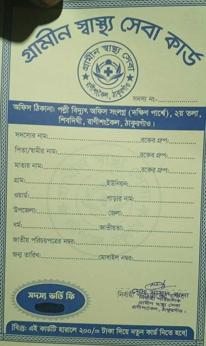 পেয়ার আলী, নিজস্ব প্রতিনিধি:– ঠাকুরগাঁওয়ের রাণীশংকৈলে প্রতারণার এক নতুন ফাঁদ পেতে গ্রামের সহজ সরল মানুষের স্বাস্থ্য সেবার নাম করে কয়েক লক্ষ টাকা আদায়ের হিরিক পড়েছে।