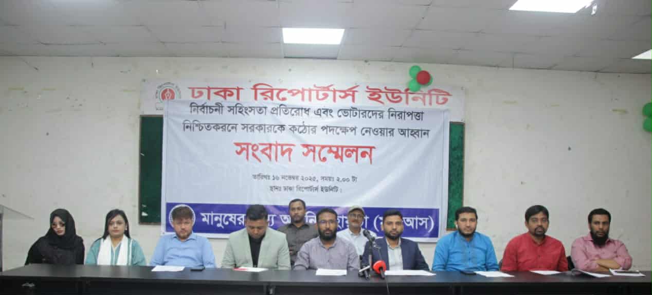 রোববার (১৬নভেম্বর) বিকেলে ঢাকা রিপোর্টার্স ইউনিটেতে ‘নির্বাচনী সহিংসতা রোধে ও ভোটারদের নিরাপত্তা নিশ্চিতে সরকারকে কঠোর পদক্ষেপ নেওয়ার আহ্বান’- শীর্ষক সংবাদ সম্মেলনে এই দাবি পেশ করা হয়েছে।