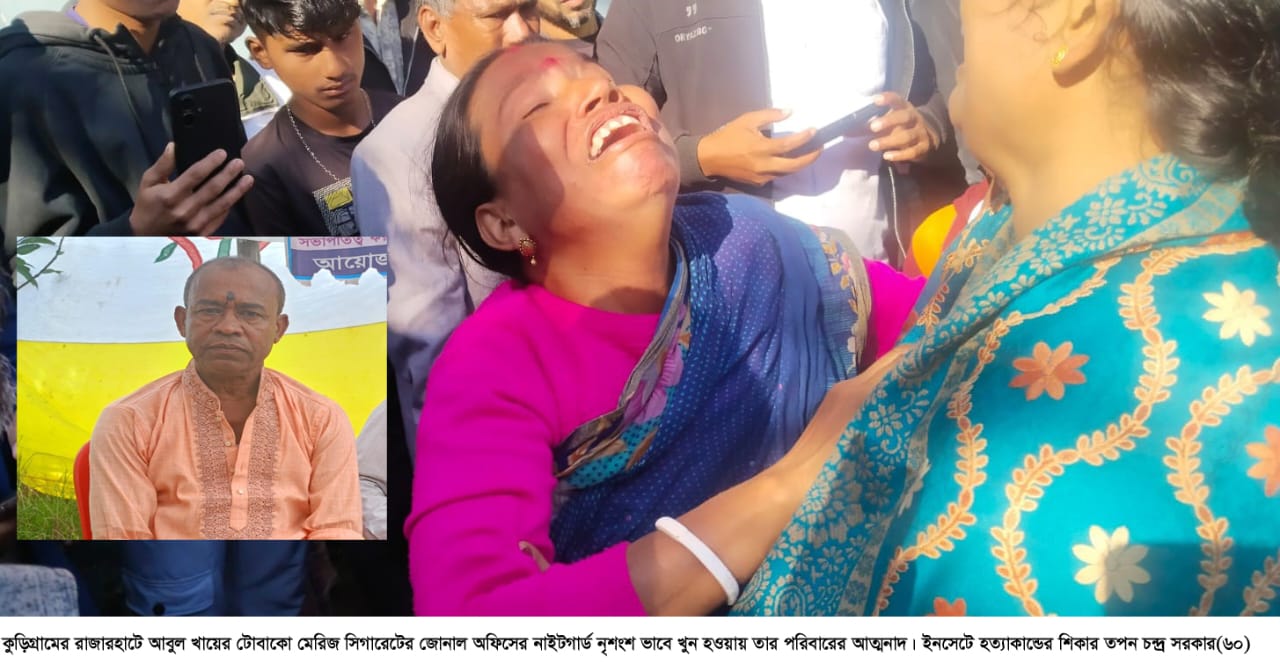 এলাকাবাসী ও পুলিশ জানান, ওই অফিসে তপন চন্দ্র সরকার(৬০) নামের এক ব্যক্তি দীঘ ৮/৯ বছর ধরে নাইটগার্ড হিসেবে দায়িত্ব পালন করে আসছিল। তিনি উলিপুর উপজেলার দলদলিয়া ইউনিয়নের উত্তর দলদলিয়া গ্রামের মৃত ধীরেন্দ্র নাথের ছেলে। তিনি পুরো পরিবার নিয়ে গ্রামীণ ব্যাংকের পাশে গালামাল ব্যবসায়ী রঞ্জু মিয়ার বাসা ভাড়া নিয়ে বসবাস করছিলেন। ঘটনার দিন গত রোববার(১৪ডিসেম্বর) সকালে তপন সরকারকে মোবাইল ফোনে না পেয়ে তাঁর ছেলে মানিক সরকার অফিসে এসে দেখতে পান অফিসের কেচিগেট খোলা। ভিতরে গিয়ে দেখেন তার বাবাকে হত্যা করে লাশ মেঝেতে ফেলে রেখেছে। তার আত্ম চিৎকারে এলাকাবাসী ছুটে আসেন। কোম্পানীর ম্যানেজার আনোয়ার কামাল লিটন ঘটনাস্থলে এসে অফিস ডাকাতি হয়েছে। শনিবার গভীর রাতে দূর্বৃত্তরা তপন সরকারের মাথায় আঘাত করে হত্যা করে অফিসের লকারে রাখা ৩৪লাখ ২০হাজার টাকা নিয়ে সটকে পড়েছে। এলাকাবাসীরা জানান, যেভাবে তপনকে খুন করা হয়েছে তাতে বুঝা যায় খুনিরা ৮/১০ জন এ মিশনে অংশ নিয়েছে। এদিকে তপন সরকারের ছেলে মানিক সরকার বলেন, শনিবার রাত ১২টাকা ৪২মিনিটেও বাবা আমার বোনের সাথে কথা বলেছে। সে সময় ম্যানেজার সহ কোম্পানীর সেলসম্যানরা অবস্থান করছিল। রবিবার সকালে অফিসের মেজেতে বাবার রক্তমাখা লাশ পাওয়া গেল। আমি বাবার হত্যাকারীদের বিচার এবং ফাঁসি চাই। তপন সরকারের লাশ দেখতে মুহুর্তের মধ্যে হাজারও লোকের ভিড় জমে। খবর পেয়ে রাজারহাট থানা পুলিশ ঘটনাস্থলে গিয়ে লাশ উদ্ধার করেন। পরে সকাল সাড়ে ১১টায় সিআইডির ফরেনসিক টিম এসে লাশের সুরতহাল রিপোর্টসহ খুনের আলামত সংগ্রহ করেন।