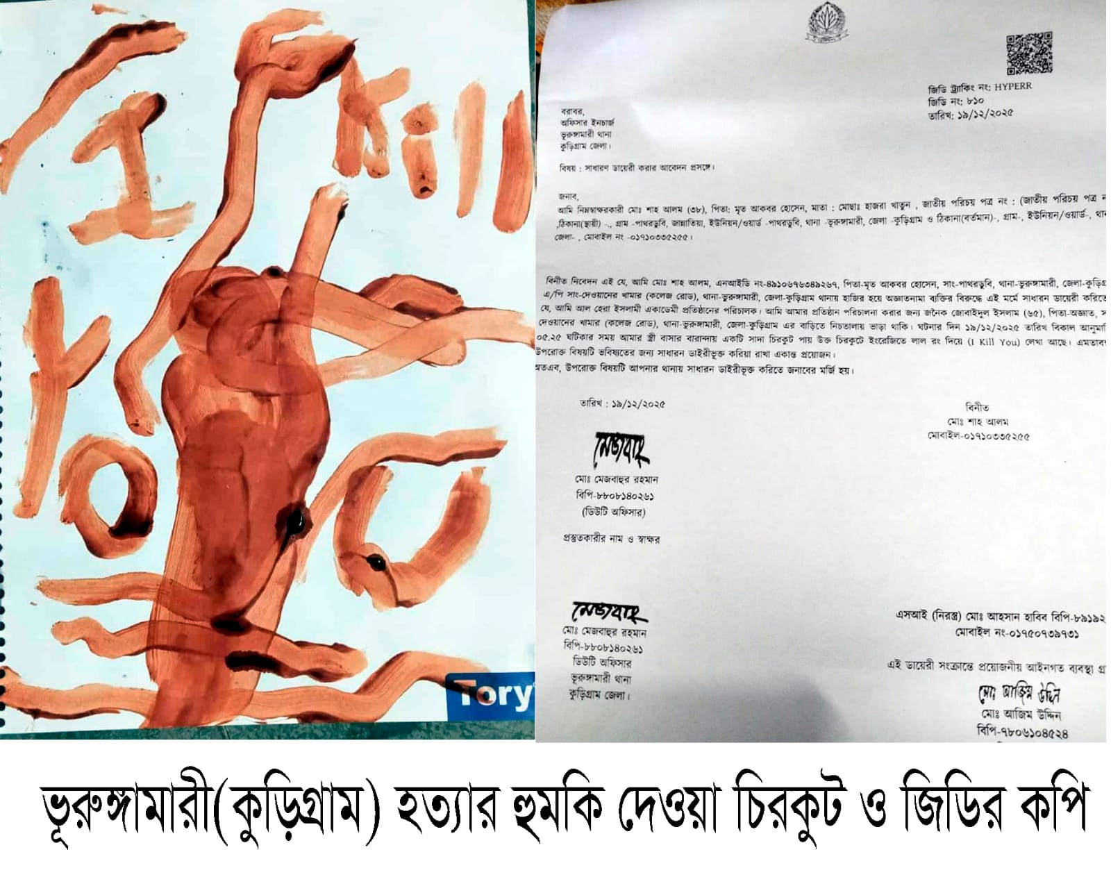 শুক্রবার সন্ধ্যায় আমার স্ত্রী বাসার বেলকনিতে একটি চিরকুট দেখতে পায়। সেই চিরকুটে ইংরেজিতে লাল রং দিয়ে “আই কিল ইউ” লেখা ছিল। আমি তখন বন্ধুদের সাথে কুড়িগ্রামে ইজতেমায় যাচ্ছিলাম। পথিমধ্যে নাগেশ্বরীতে পৌঁছলে আমার স্ত্রী হত্যার হুমকি পাওয়া চিরকুটটির বিষয়ে জানায়। তৎক্ষনাৎ ইজতেমায় না গিয়ে বাসায় ফিরে আসি। পরে রাতেই থানায় একটি জিডি করি। এ ঘটনায় আমারা আতঙ্কে আছি।